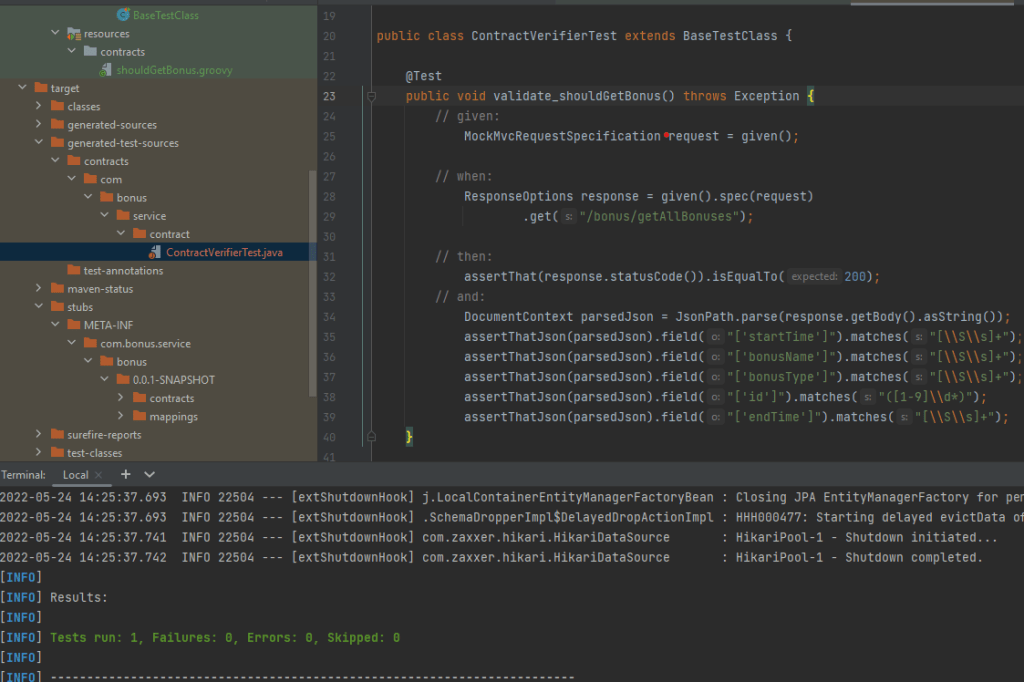 Running mvn clean install on the bonus-service project will generate the stubs and automatically create a test class that checks the contract fields
