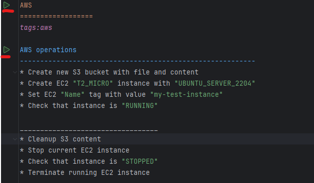 This configuration also establishes a scenario context, which we will utilize to store various parameters such as instanceId or bucket name for later interaction with the objects.