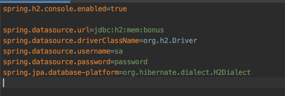The service will use the H2 in memory database and this can be setup with the following properties